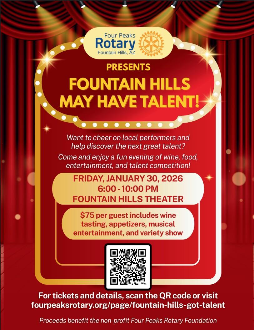 Is the next big star hiding in Fountain Hills or surrounding communities? The Four Peaks Rotary Club is ready to find out with a special event that puts the fun in fundraising! Join the organization for an unforgettable evening of entertainment at “Fountain Hills May Have Talent,” kicking off at 6:00 pm on Friday, January 30, at the intimate Fountain Hills Theater, 11445 N. Saguaro Boulevard in Fountain Hills, AZ.