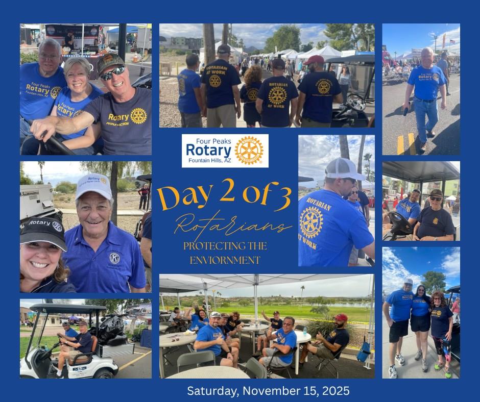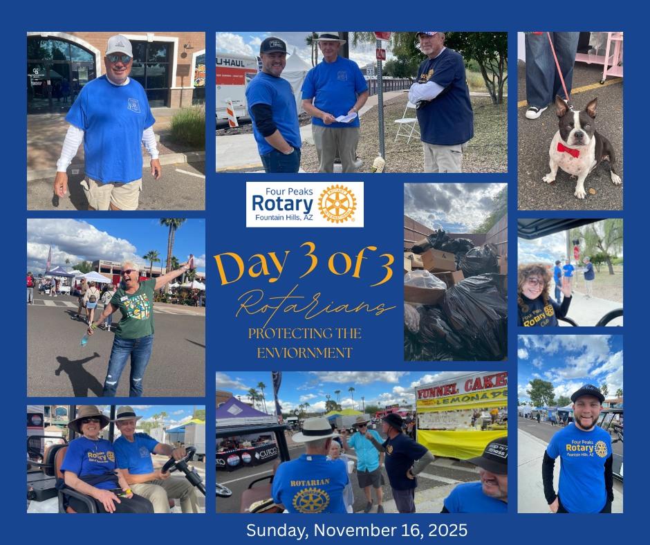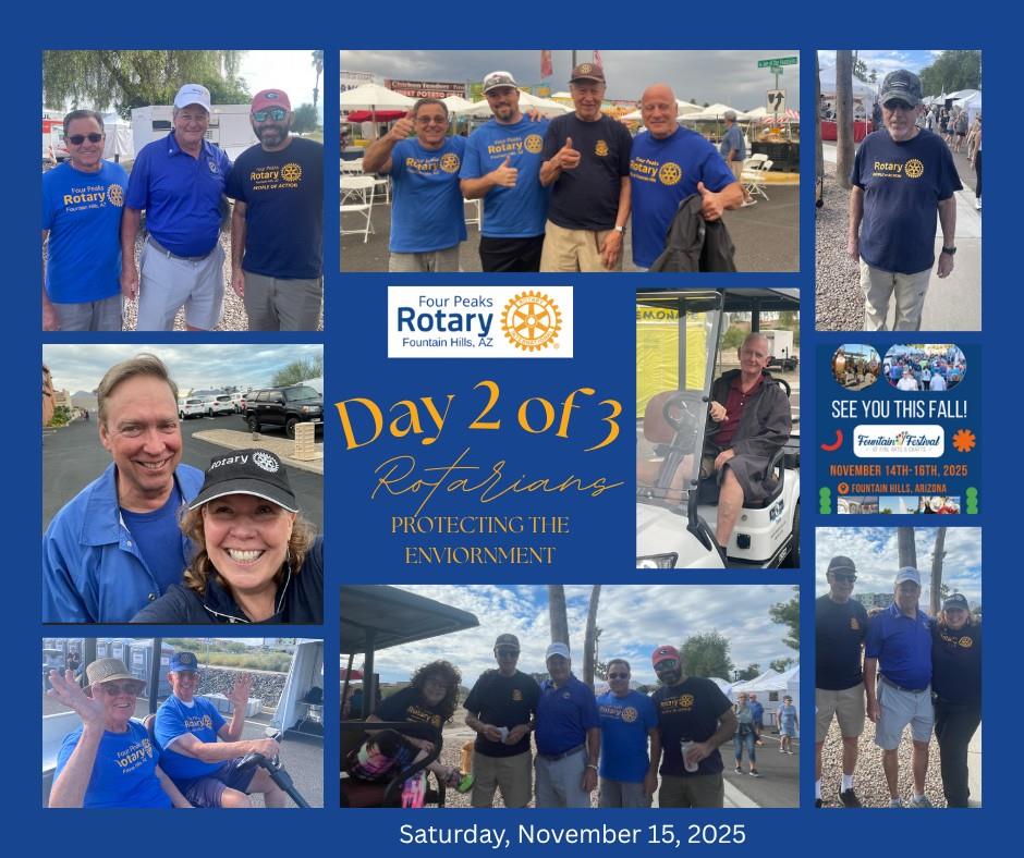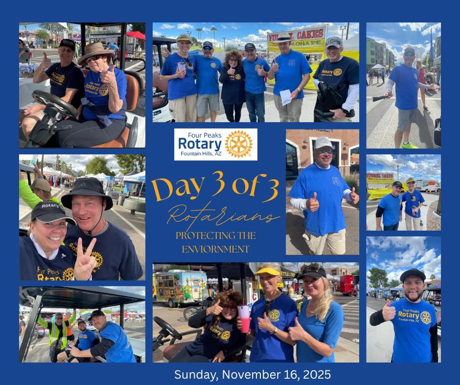 Throughout the weekend of November 14-16, 2025, Rotarians volunteered in rotating shifts to keep the downtown streets clean, safe, and welcoming for the thousands of guests who visited the fair. With smiles, gloves, and plenty of teamwork, they ensured that discarded cups, wrappers, and debris never dimmed the beauty of the event or the charm of Fountain Hills.