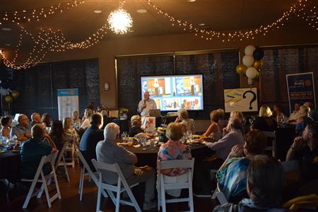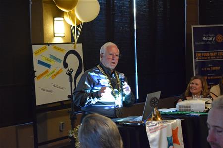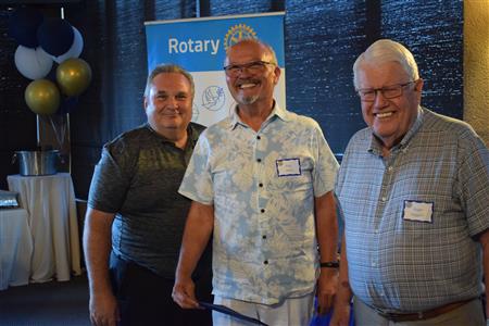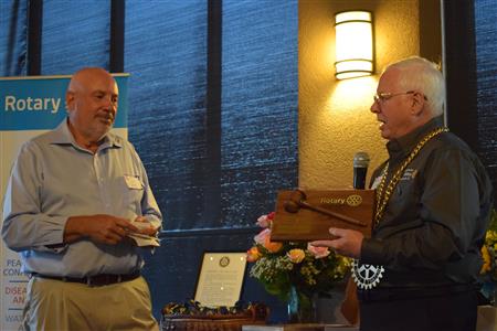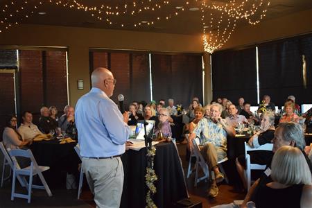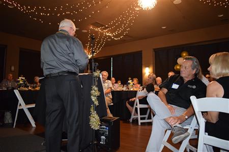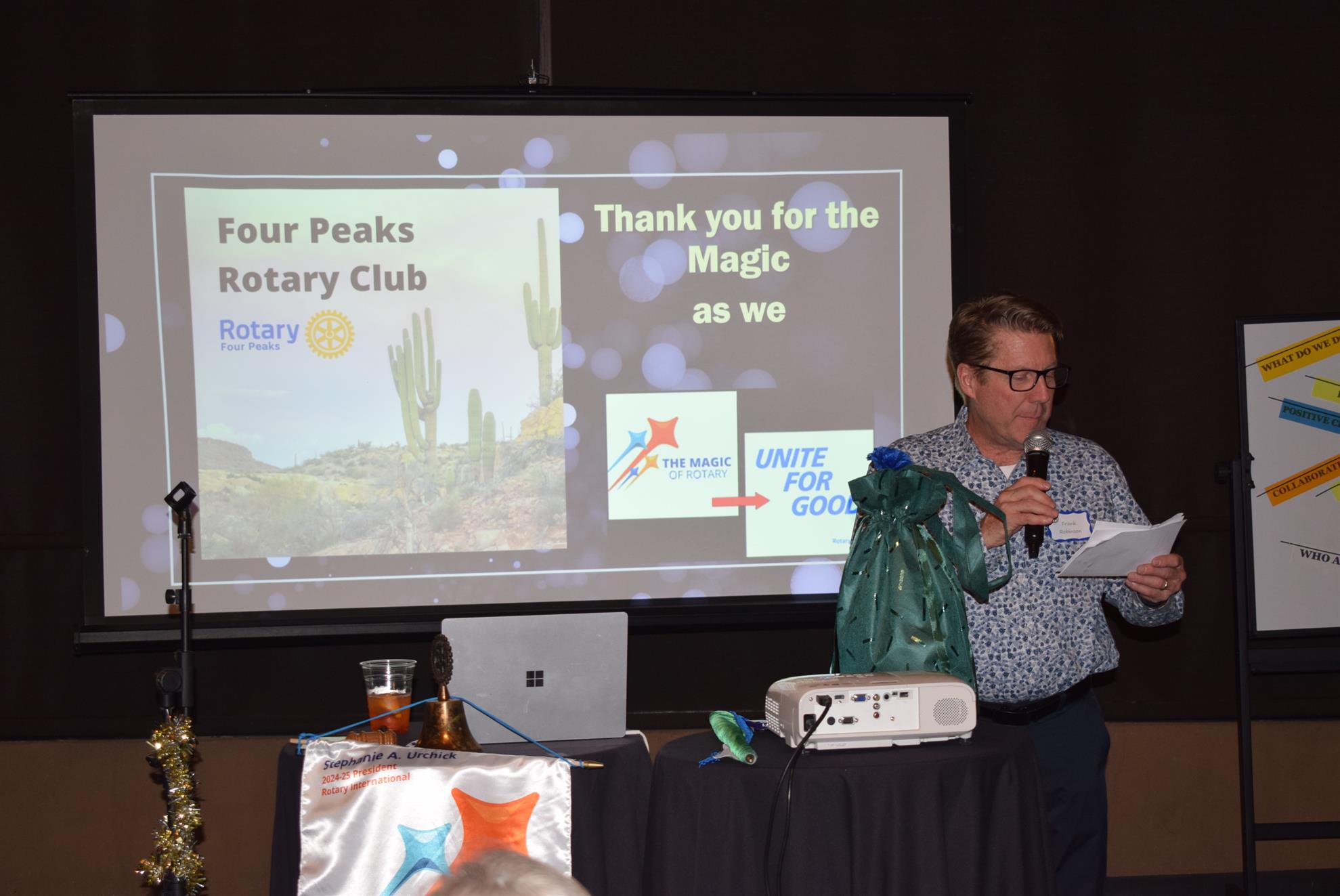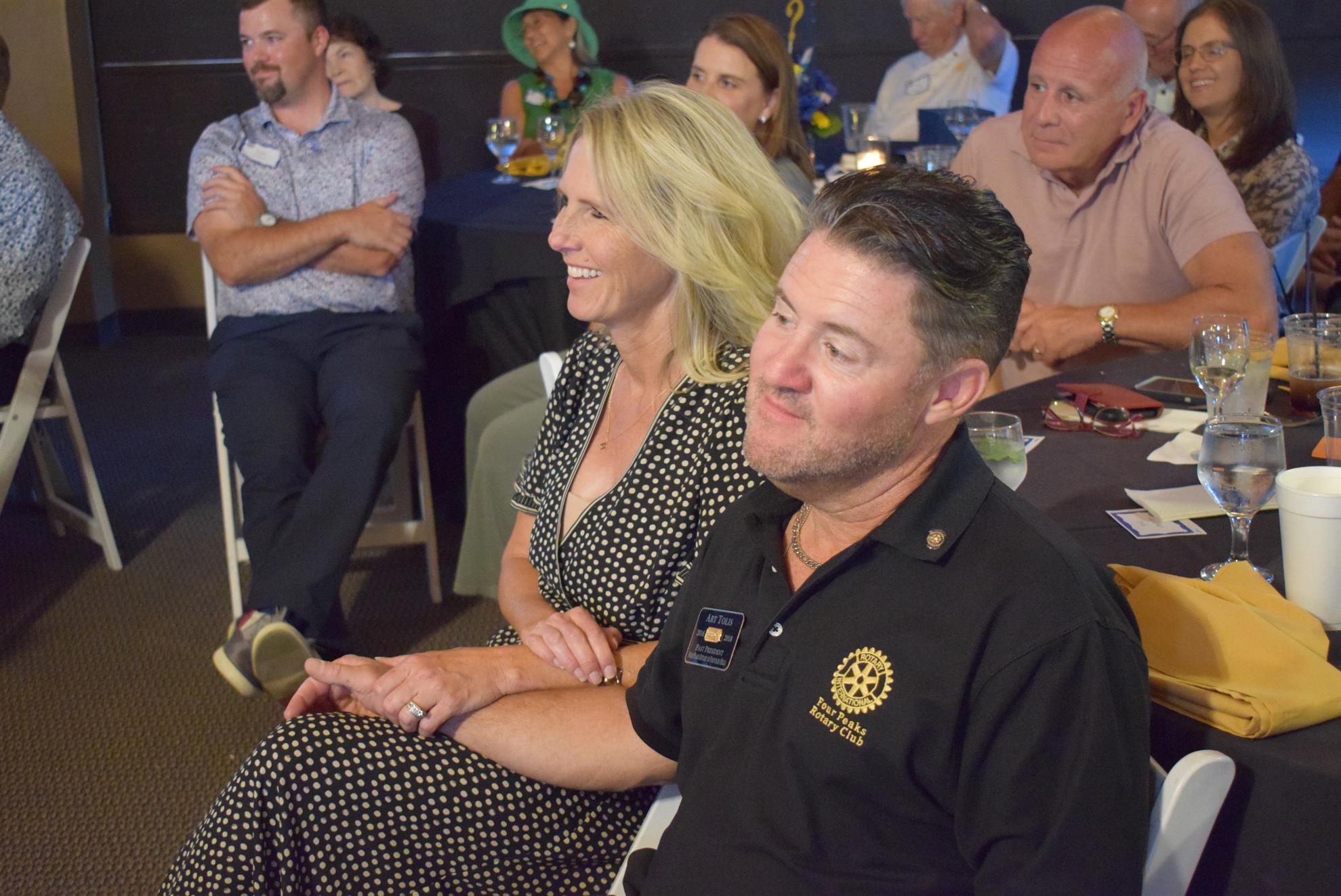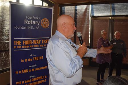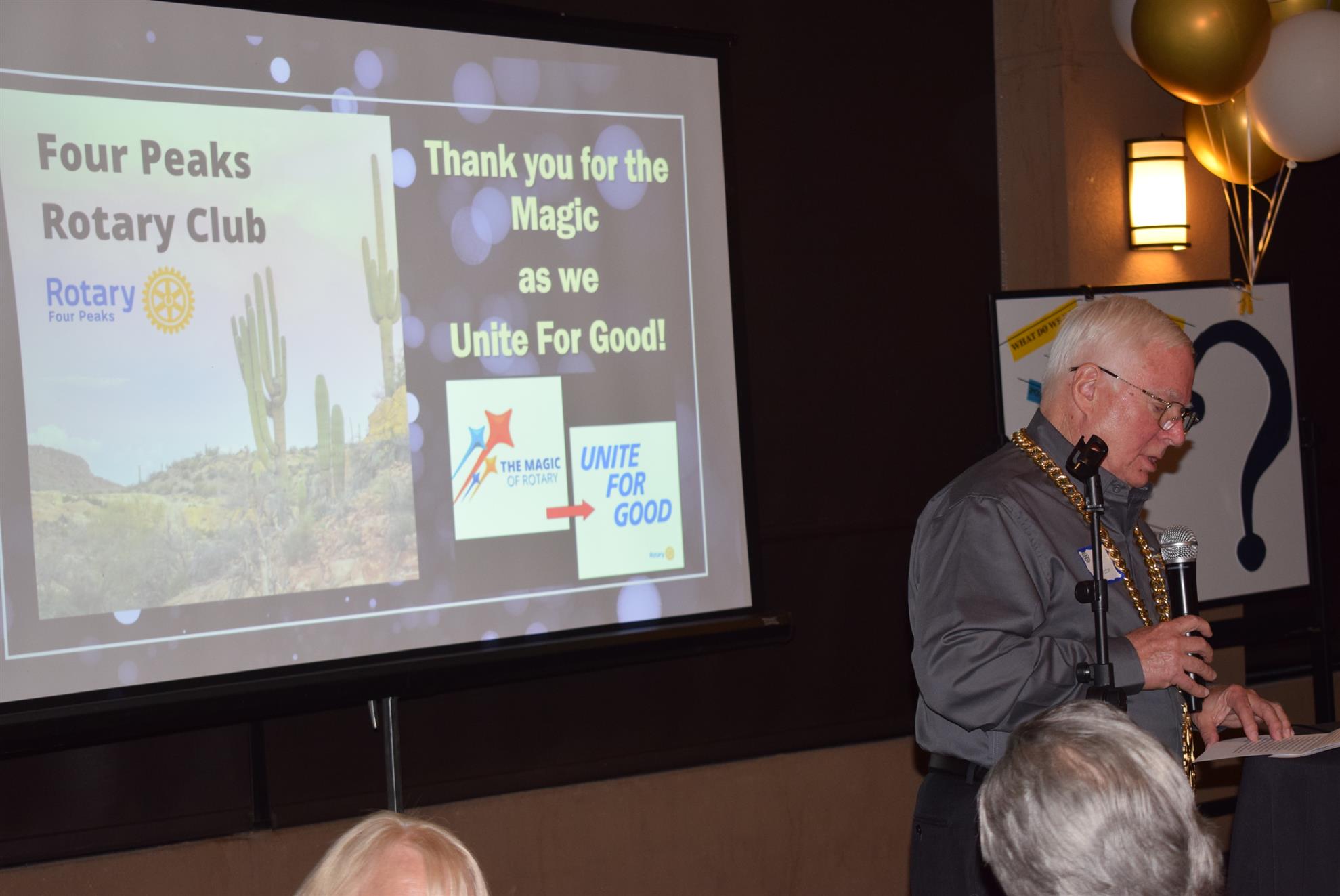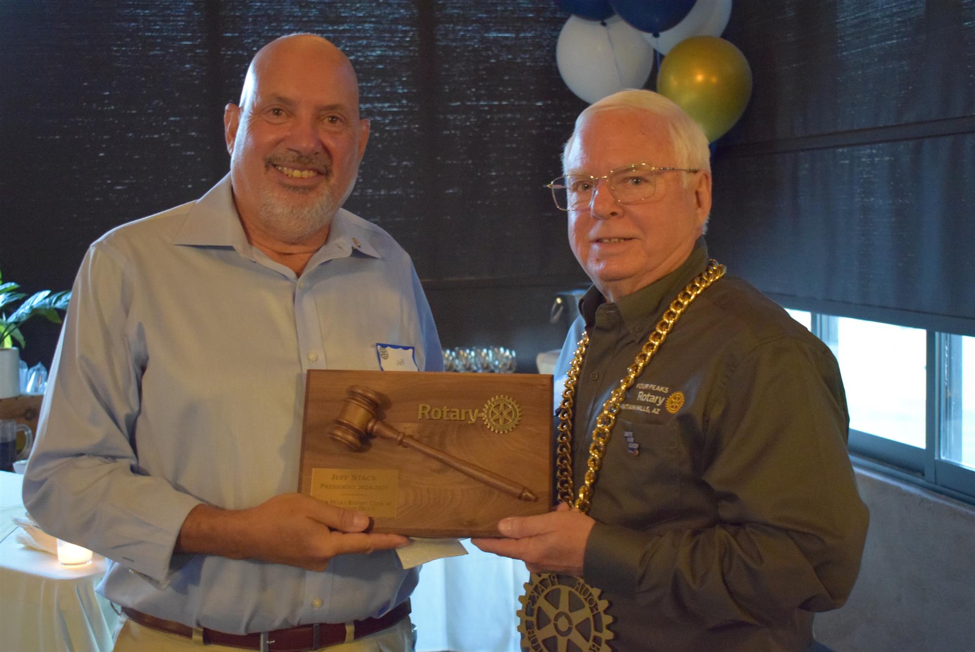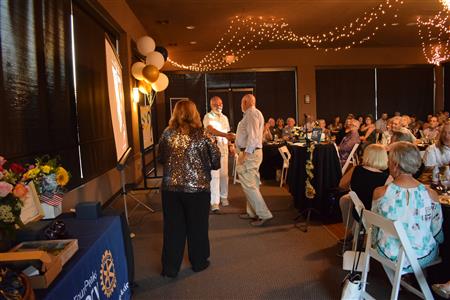 Magic Man Jeff Stack recaps a great year of Four Peaks Rotary achievements and hands the gavel over to incoming president Nick Proctor as club members, new members and spouses celebrate friendship and service above self.