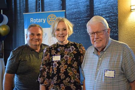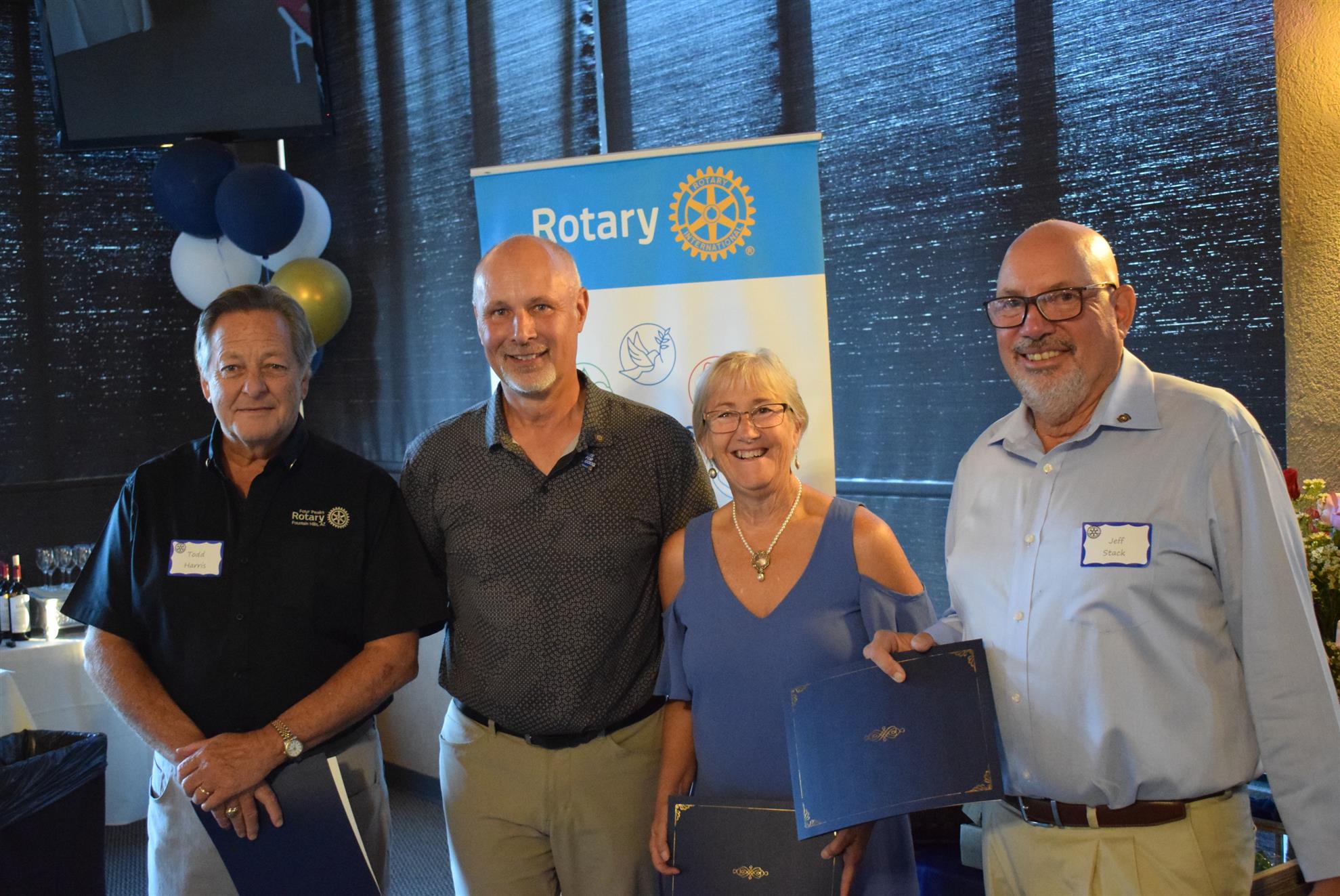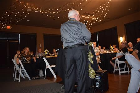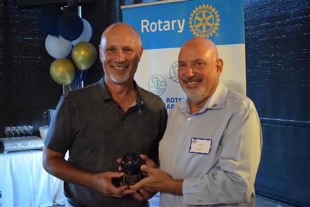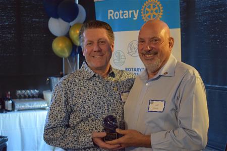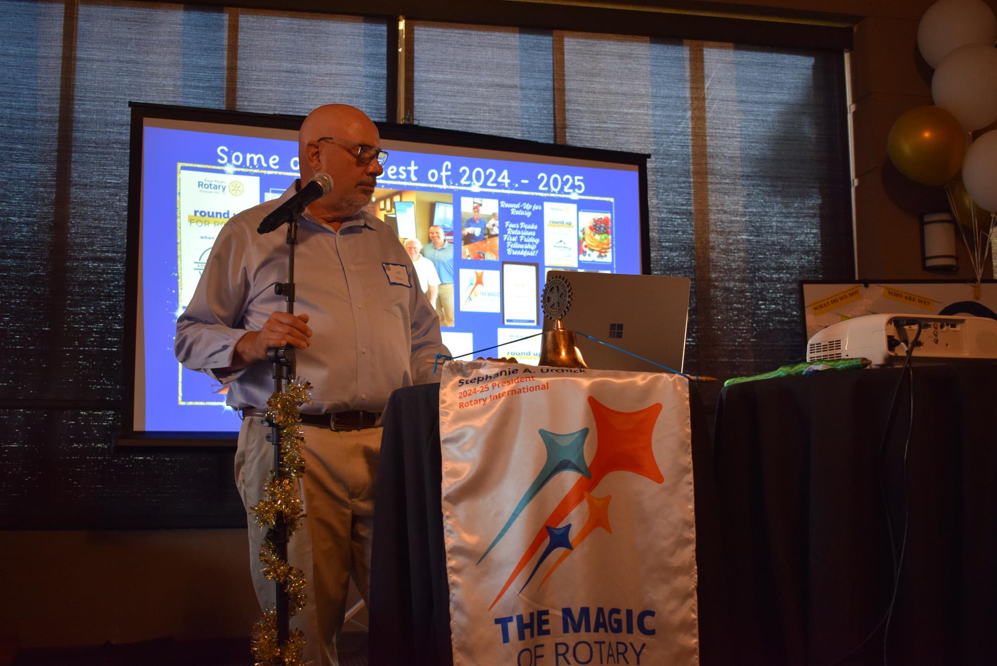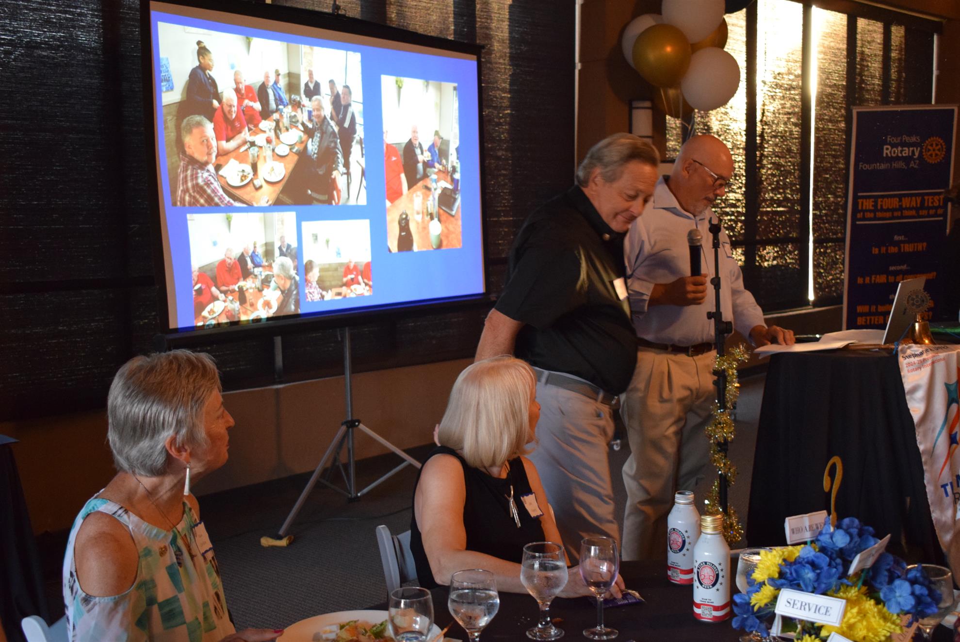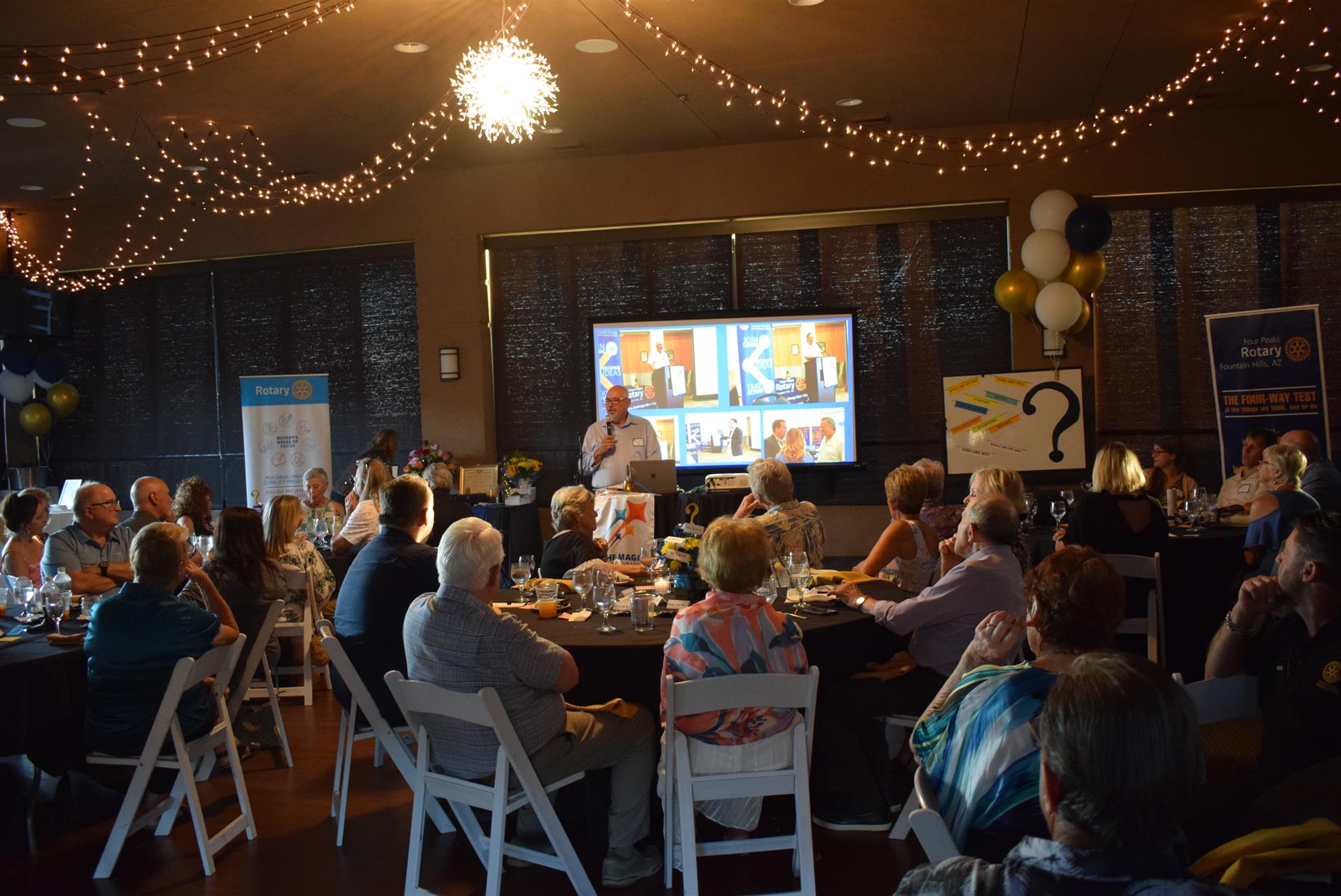 Magic Man Jeff Stack recaps a great year of Four Peaks Rotary achievements and hands the gavel over to incoming president Nick Proctor as club members, new members and spouses celebrate friendship and service above self.